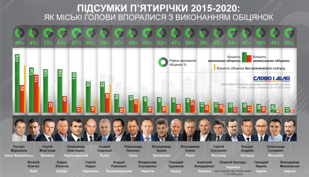 Вчера, 20 октября, аналитический портал «Слово и дело» опубликовал свое исследование о том, сколько обещаний было выполнено мэрами крупных городов за 5 лет. Эта информация вполне актуальна на фоне того, что 25 октября мы изберем нового мэра (или переизберем действующего). Поэтому, для правильного решения, давайте посмотрим, как Руслан Марцинкив справился с выполнением своих обещаний в течение 2015-2020 годов. Следует отметить, что расчеты включают как предвыборные, так и текущие: те, которые уже выполнены, невыполненные, а также те, которые в настоящее время осуществляются. Также отметим, что бюджетный год еще не закончился, поэтому некоторые обещания могут получить статус выполненных или провалиться даже после выборов. Время для реализации плана нашего главы города еще есть, рассказывает «yes-frankivsk.com.ua«.
